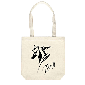 Small canvas bag. 14″ x 15.5″ 100% cotton. Printed in Nashville. $28.00 Choose just the horse, or horse with name or farm. Large tote 19.5″ x 15″ $30.00